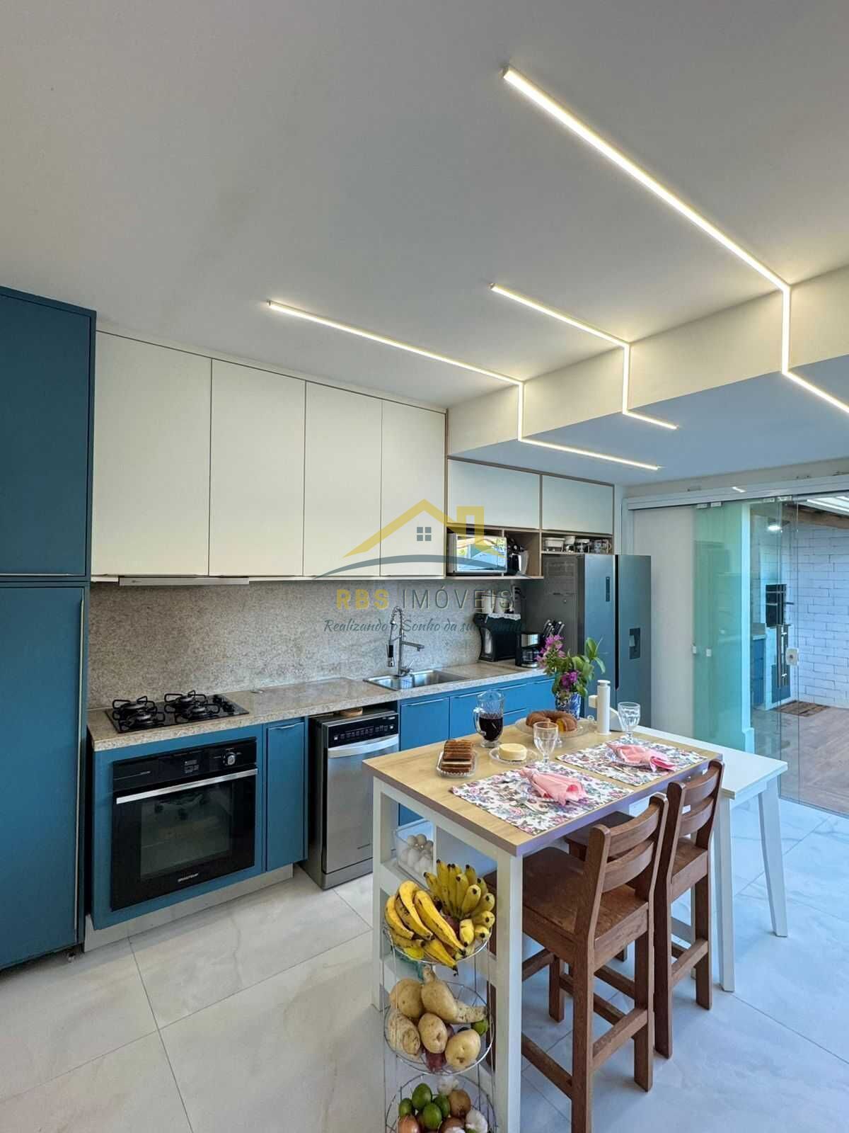 Cozinha integrada à área gourmet com churrasqueira e iluminação embutida