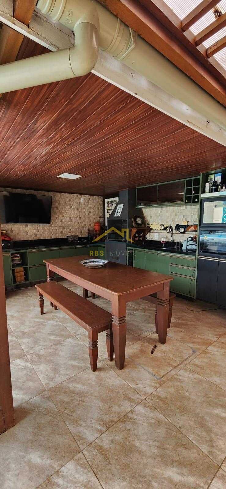 Área externa com quiosque e mesa de madeira